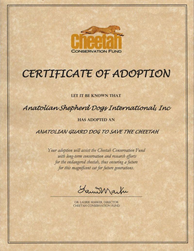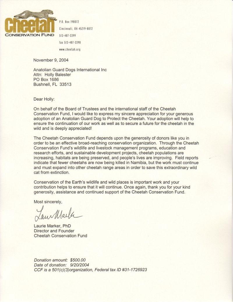 toward the sponsorship of another CCF project Anatolian. CCF is the Cheetah Conservation Fund.